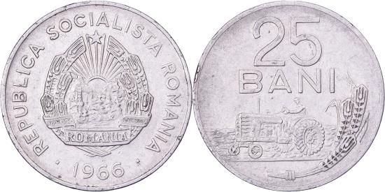 | | Romania, 25 Bani, 1966, Nickel Clad Steel, , KM:94 | | | National emblem, Value above tractor | | FEATURES |