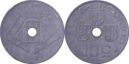 | | Belgium, Napoleon III, 10 Centimes, 1941, Brussels, Zinc, , KM:126 | | | Three shields above denomination, hole at center, legend in Dutch, Crowned design above date, hole at center, BELGIE-BELGIQUE | | FEATURES |