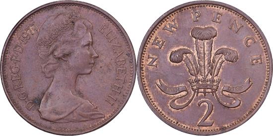 | | Great Britain, Elizabeth II, 2 New Pence, 1977, Bronze, , KM:916 | | | Young bust right, Welsh plumes and crown, Arnold Machin | | FEATURES |