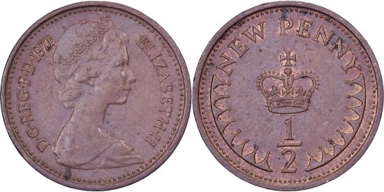 | | Great Britain, Elizabeth II, 1/2 New Penny, 1971, Bronze, , KM:914 | | | Young bust right, NEW PENNY above crown and value fraction, Arnold Machin | | FEATURES |