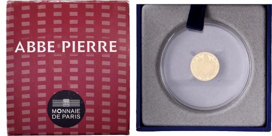 | | France, 5 Euro, Monnaie de Paris, 2012, Paris, Gold, , KM:1896 | | | Pierre's bust at left, shaddow figure at right, Emmaus International logo and quote, Abbé Pierre, with box and certificate | | FEATURES |