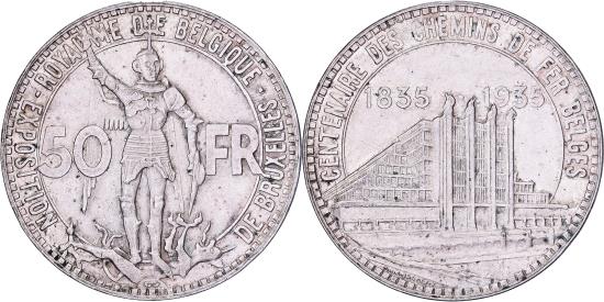 | | Belgium, 50 Francs, 50 Frank, 1935, Silver, , KM:106.1 | | | St. Michael slaying dragon (Brussels' patron saint), Palais des Expositions, Heysel Park in Brussels. Two dates above, legend in French, Exists in positions A and B, values are the same., DE BELGIQUE | | FEATURES |