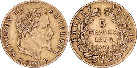 | | France, Napoleon III, 5 Francs, Napoléon III, 1864, Strasbourg, Bent flan | | | Napoléon III, Laureate head right, Denomination within wreath, NAPOLEON III EMPEREUR | | FEATURES |