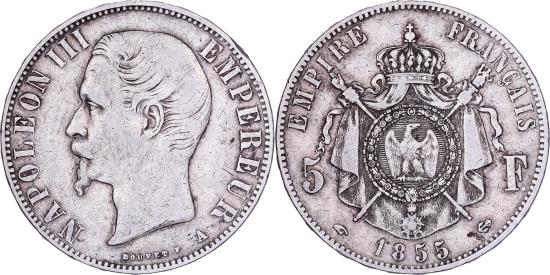 | | France, Napoleon III, 5 Francs, Napoléon III, 1855, Paris, Silver, | | | Napoléon III, Head left, Crowned and mantled arms divide denomination, NAPOLEON III EMPEREUR | | FEATURES |