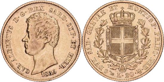 | | Italian States, SARDINIA, Carlo Alberto, 20 Lire, 1835, Genoa, Gold, | | | Head to left, date below, Crowned squarish shield of Savoy arms between 2 laurel branches, collar of order suspended below, value 'L.20' at bottom, mintmarks at lower left, Ref. Cud. 1045a,c,d,h,k-m,p,r,s,v,y,ab,ac; Fr. 1143. Prev. C#115.1. 1831 and some 1832 issues have edge inscription (FERT-FERT-FERT), rest have reeded edges., CAR. ALBERTVS D .G. REX SARD. CYP. ET HIER. | | FEATURES |