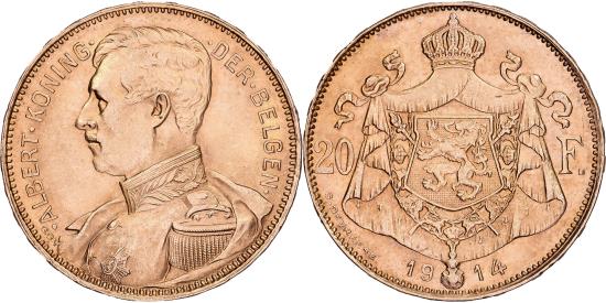 | | Belgium, 20 Francs, 20 Frank, 1914, Gold, , KM:79 | | | Armored bust of Albert, left, legend in Dutch, Crowned arms divide denomination and date, tranche A, DER BELGEN | | FEATURES |