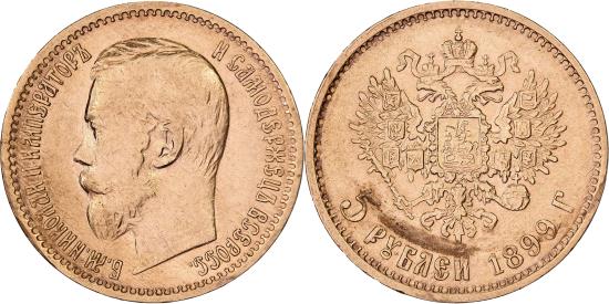| | Russia, Nicholas II, 5 Roubles, 1899, Saint Petersburg, Gold, , KM:62 | | | Head left, Crowned double-headed imperial eagle, ribbons on crown, Struck at St. Petersburg without mint mark. | | FEATURES |