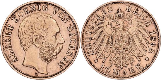 | | German States, SAXONY-ALBERTINE, Albert, 10 Mark, 1898, Muldenhütten, Gold | | | Crowned imperial eagle, type III | | FEATURES |