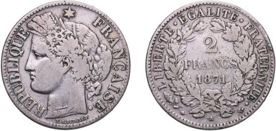 France Third Republic 1871 A 2 Francs (Reverse Legend) Silver (.835) Paris Mint 9.79g VF KM 817 Gad 1789 530 Franc 2014 265