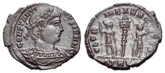 Constantine II (Caesar, 316-337). Æ Follis (16mm, 1.44g, 12h). Treveri, 335-7. Laureate and cuirassed bust r. R/ Two soldiers holding spears and shields with one standard between them; •TRP•. RIC VII 591. Brown patina, Good VF