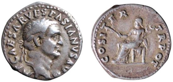 Reign: Emperor, A.D. 69-79. Denomination: AR Denarius. Diameter: 18 mm. Weight: 3.38 grams. Mint: Rome, A.D. 70 Obverse: Laureate head right. Reverse: Pax, draped, seated left, holding olive branch and cradling winged caduceus.