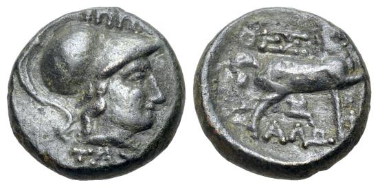 | Thessaly, Thessalian League, c. 196-27 BC. Æ 16mm. Ippaitas, magistrate. Helmeted head of Athena R/ HORSE |