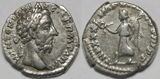 Roman Empire Marcus Aurelius AR Denarius (Rome, AD 176-177) M ANTONINVS AVG GERM SARM, laureate head to right / TR P XXXI IMP VIII COS III P P, Victory advancing to left, holding wreath and palm. 3.20 grams, 19 mm. Good Very Fine. RIC 378, RSC 949. |