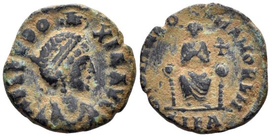 | Aelia Eudoxia, Augusta. 400-404 AD. AE3 (2.55g, 16mm). Alexandria mint. Struck 400-402 AD. RIC 84 |