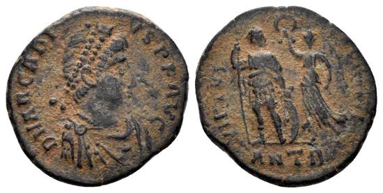 Arcadius. 383-408 AD. AE3 (2.31g, 17.5mm). Antioch mint. Struck 395-401 AD. Obv.: D N ARCADIVS P F AVG, diademed, draped and cuirassed bust of Arcadius right. Rev.: VIRTVS EXERCITI, emperor standing left, head right, holding spear and resting hand on grounded shield; to his right, Victory standing left, crowning him with wreath; ANTB. RIC 70. VF.