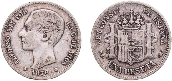 Spain Kingdom 1876 DEM 1 Peseta - Alfonso XII (1st portrait) Silver (.835) Royal Mint of Spain (4427000) 4.85g VF KM 672 Cal 54