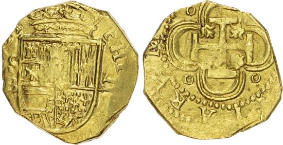 | Spain, Philip III (1598-1621) or later, gold 2 Escudos, Seville, mintmark S B, c. 1598-1612, OMNIVM type, 6.79g (A&C 1050). Good Very Fine. Interesting type of uncertain start date that could date to reign of Philip II according to literature. |
