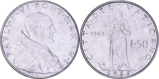 | | Vatican, Paul VI, 50 Lire, 1963, Rome, Stainless Steel, , KM:81.1 | | | Bust right, Spes standing with anchor date and value are divided, AN | | FEATURES |
