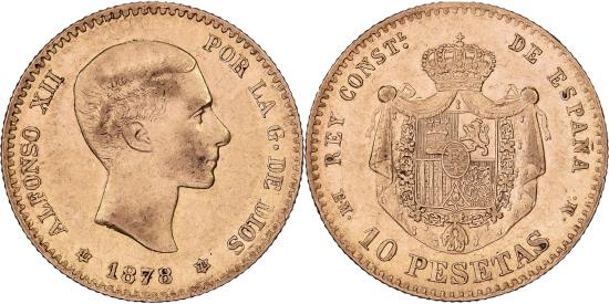 | | Spain, Alfonso XII, 10 Pesetas, 1878, Madrid, Gold, , KM:677 | | | Young head right, Crowned mantled arms, Mint mark: 6-pointed star., ALFONSO XII... | | FEATURES |