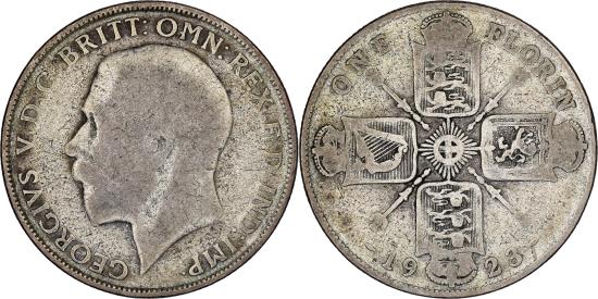 | | Great Britain, George V, Florin, Two Shillings, 1923, Silver, , KM:817a | | | Head left, Cross of crowned shields, sceptres in angles, Bertram MacKennal | | FEATURES |
