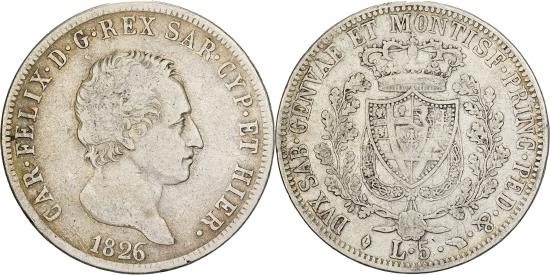 | | Italian States, SARDINIA, Carlo Felice, 5 Lire, 1826, Torino, Silver, | | | Head to right, date below, Crowned spade-shaped shield of 4-fold arms, with central shield of Savoy eagle, between 2 oak branches, collar of order suspended below, value 'L.5.' divides mintmarks at bottom, Ref. Cud. 1035d,f,h,j,l,n,p.s. Prev. C#105.2., CAR. FELIX D. G. REX SAR. CYP. ET HIER. | | FEATURES |