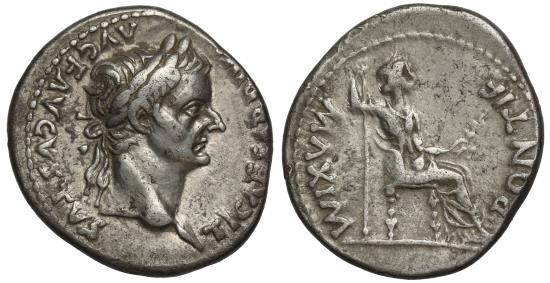 Tiberius (AD 14-37), silver Denarius, "The Tribute Penny", Lugdunum, c. AD 18-35, TI CAESAR DIVI AVG F AVGVSTVS, laureate head right, rev. PONTIF MAXIM, Livia, as Pax, seated, holding sceptre, 3.79g, 6h (RIC I, 30). Very fine. |