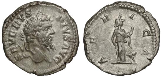 Septimius Severus (AD 193-211), silver Denarius, Rome, AD 202-210, SEVERUS PIVS SVG, rev, AFRICA, Africa standing, 3.68g, 6h (RIC IV, 253). Very fine. Septimius Severus was born in Leptis Magna, Libya, North Africa. A lifetime portrait of him, in tempera on wood, survives to this day - The Severan Tondo. |