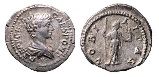 Roman coins: Geta as Caesar silver denarius, Good VF