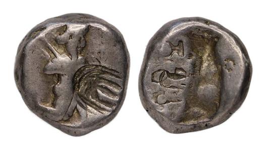PERSIA, Achaemenid Empire. temp. Xerxes II to Artaxerxes II. Circa 420-375 BC. AR Siglos (5.33 grams).Lydo-Milesian standard. Sardes mint.Persian king or hero, wearing kidaris and kandys, quiver over shoulder, in kneeling-running stance right, holding spear and bow, large cm in front / Incuse punch. Carradice Type III. Condition: Choice VF, fine metal, high relief and dark iridescent toning from old collection. |