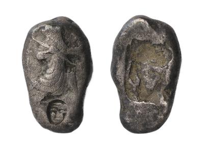 PERSIA, Achaemenid Empire. temp. Xerxes II to Artaxerxes II. Circa 420-375 BC. AR Siglos (5.58 grams).Lydo-Milesian standard. Sardes mint.Persian king or hero, wearing kidaris and kandys, quiver over shoulder, in kneeling-running stance right, holding spear and bow / Incuse punch. Carradice Type III. Obv. countermark below in the form of a facing head! Condition: Near VF, dark iridescent toning from old collection. |