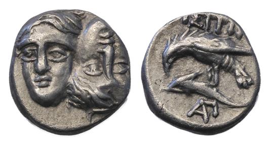 Facing male heads the left inverted / Sea-eagle left grasping dolphin with talons monogram below. Reff. Cf. AMNG I 421 (drachm) cf. SNG BM Black Sea 254-255 (drachm)