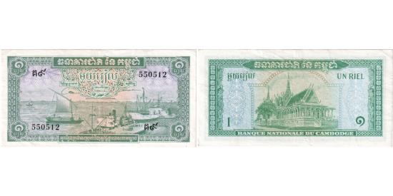 | | Cambodia, 1 Riel, UNC(65-70) | | | Signature 12., Boats dockside in port of Phnom-Penh., Royal palace throne room., Grayish green on multicolor underprint. | | FEATURES |