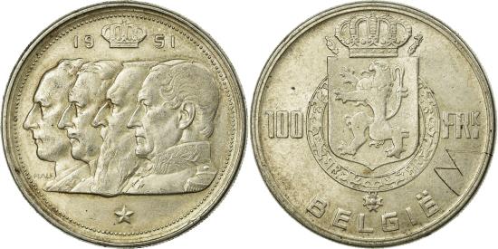 | | Coin, Belgium, 100 Francs, 100 Frank, 1951, , Silver, KM:139.1 | | | Crowned arms within wreath divide denomination, legend in Dutch, Conjoined heads left of Leopold I, Leopold II, Albert I and Leopold III, left, Crown divides date at top, star at bottom, BELGIE | | FEATURES |