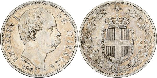 | | Italy, Umberto I, 2 Lire, 1881, Rome, Silver, , KM:23 | | | Head right, Crowned shield within wreath divides value, star above, UMBERTO I... | | FEATURES |