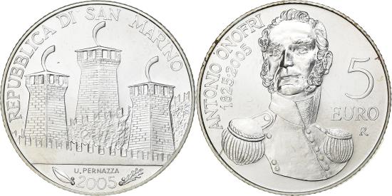 | | San Marino, 5 Euro, 2005, Rome, Silver, , KM:468 | | | Three towers, Antonio Onofri and value | | FEATURES |