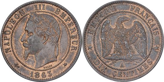 | | France, Napoleon III, 10 Centimes, 1863, Paris, Bronze, , Gadoury:253 | | | Laureate head of Napoleon III, left. Date below., Eagle facing, wings spread, head to the right, standing on a thunderbolt. Denomination and mint letter below. | | FEATURES |