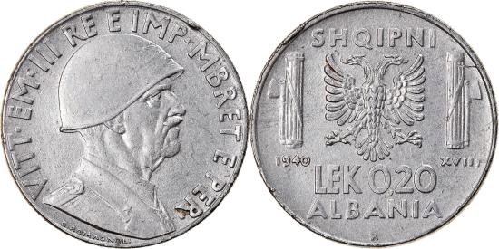 | | Coin, Albania, Vittorio Emanuele III, 0.20 Lek, 1940, Rome, , Stainless | | | Helmeted head right, Double eagle between fasces, value below | | FEATURES |