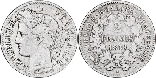 | | France, 2 Francs, Cérès, 1849, Paris, Silver, , Gadoury:522, KM:760.1 | | | Cérès, Liberty head with grain wreath left, Denomination within wreath | | FEATURES |
