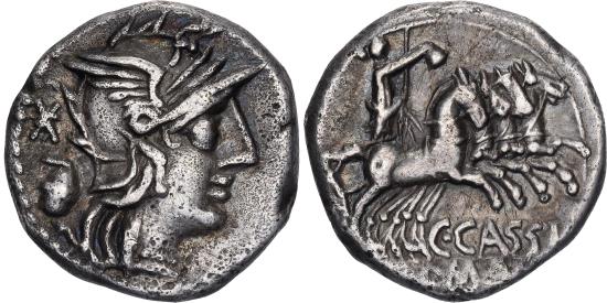 | | Cassia, Denarius, 126 BC, Rome, Silver, , Crawford:266/1 | | | Helmeted head of Roma, right. Behind, voting urn, X., Libertas in quadriga, right, holding reins and rod (vindicta) in left hand and pileus in right hand., Issuer: C. Cassius., C·CASSI // ROMA | | FEATURES |