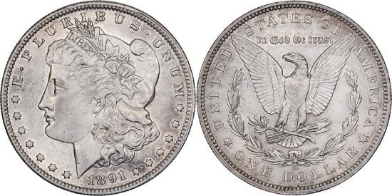 | | United States, Dollar, Morgan Dollar, 1891, U.S. Mint, Silver, , KM:110 | | | Morgan Dollar, Laureate head left, date below flanked by stars, Eagle within 1/2 wreath, 65DMPL values are for coins grading MS-65 deep-mirror prooflike. The 1878 8 tail feathers and 7 tail feathers varieties are distinguished by the number of feathers in the eagle's tail. On the reverse of 1878 varieties, the top of the top feather in the ar, E <Bullet> PLURIBUS <Bullet> UNUM | | FEATURES |