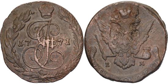 | | Russia, Catherine II, 5 Kopeks, 1771, Ekaterinbourg, Copper, , KM:59.3 | | | Crowned monogram divides date within wreath, Crowned double-headed eagle, initials below, Varieties exist. | | FEATURES |