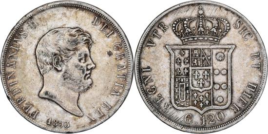 | | Italian States, NAPLES, Ferdinando II, 120 Grana, 1853, Silver, | | | Mature barded head to right, date below, Crowned shield of 6-fold arms, with central shield, value 'G.120' below, Ref. F-503; Dav. 175. Prev. C#153c., FERDINANDVS II. - DEI GRATIA REX. | | FEATURES |