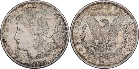 | | United States, Dollar, Morgan Dollar, 1921, U.S. Mint, Silver, , KM:110 | | | Morgan Dollar, Laureate head left, date below flanked by stars, Eagle within 1/2 wreath, 65DMPL values are for coins grading MS-65 deep-mirror prooflike. The 1878 8 tail feathers and 7 tail feathers varieties are distinguished by the number of feathers in the eagle's tail. On the reverse of 1878 varieties, the top of the top feather in the ar, E <Bullet> PLURIBUS <Bullet> UNUM | | FEATURES |
