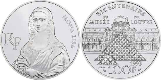 | | France, 100 Francs, Mona Lisa, Bicentenaire du Musée du Louvre, 1993, ESSAI | | | Mona Lisa, Patterned pyramids front museum, date and denomination below | | FEATURES |