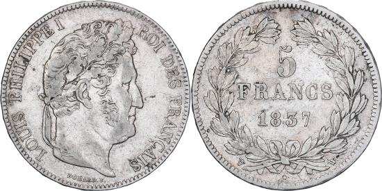 | | France, 5 Francs, Louis-Philippe, 1837, Lille, Silver, , Gadoury:678 | | | Louis-Philippe, Laureate head right, Mint marks at edge outside wreath | | FEATURES |