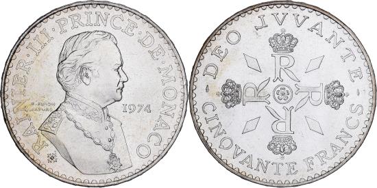 | | Monaco, Rainier III, 50 Francs, 1974, Silver, , KM:152.1 | | | Bust right, Crowned monograms divide diamonds, 25th Anniversary of Reign | | FEATURES |