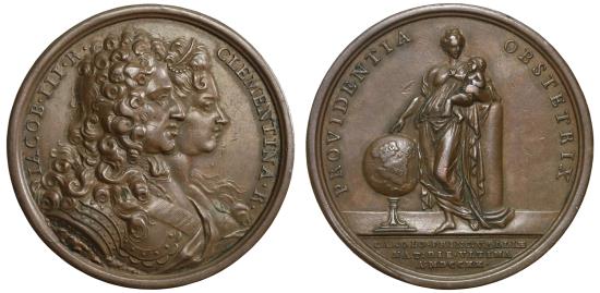 Birth of Prince Charles (III) 1720, bronze medal by Ottone Hamerani, conjoined busts of James and Clementina right, IACOB. III. R. CLEMENTINA. R. rev. PROVIDENTIA OBSTETRIX, in exergue, CAROLO. PRINC: VALIAE: NT: DIE. VLTIMA A: MDCCXX, Clementina standing with the infant Charles, to her side a column and a globe depicting the British Isles, 41mm, 30.74g (Eimer 488; MI ii 452/60). Extremely fine. |