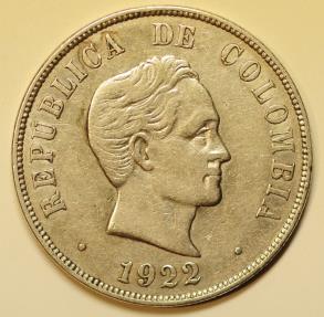 Colombia Silver 50 Centavos 1922 (P) Simon Bolivar