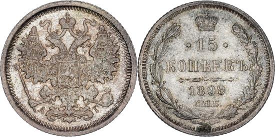 | | Russia, Nicholas II, 15 Kopeks, 1899, Saint Petersburg, Silver, | | | Crowned double-headed imperial eagle, ribbons on crown, Crown above date and value within wreath | | FEATURES |