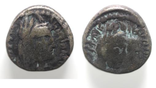 Arabia. Nabataean Kings. Aretas IV (9 BC-AD 40). AR sela (14mm, 4.11g). Petra mint. Dated regnal year 45 (AD 36/7). Laureate bust of Aretas IV r. / Jugate busts r. of Aretas IV, laureate, and Suqailat, veiled and laureate; Nabataean Aramaic date to l. Barkay 182; Meshorer 106 (misread as year 40).